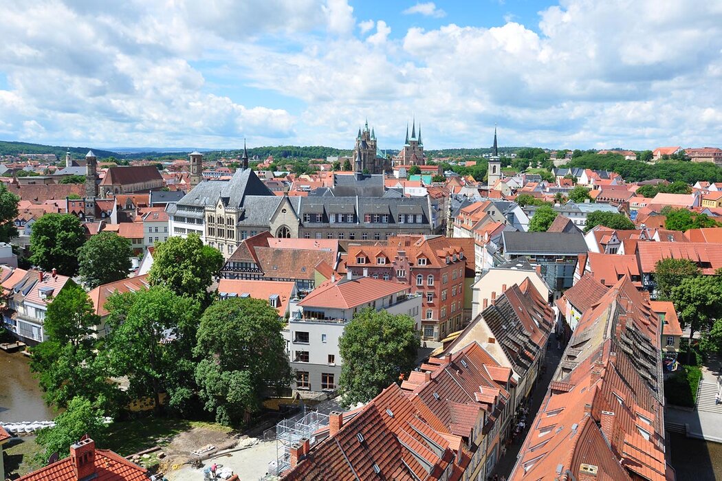 Erfurt ist die mit Abstand größte Stadt im Land Thüringen und zugleich Hauptstadt. Zahlreiche Sehenswürdigkeiten sind hier zu besichtigen, wobei der Domplatz selbstverständlich hervorsticht. Doch schauen wir zunächst auf die berühmte Krämerbrücke, die so in Deutschland nahezu einzigartig ist. Es handelt sich um eine bebaute und bewohnte Brücke mit ungeahnter Länge. Beim Flanieren ist es kaum merklich, dass der Gang über einem Gewässer stattfindet. Ein wenig erinnert dieses Konstrukt an die berühmte Rialto-Brücke in Venedig oder an den Ponte Vecchio in Florenz. Wer einen Blick über Erfurt bekommen möchte, steigt auf den Glockenturm der Ägidienkirche. Die Sicht geht über die Krämerbrücke hinweg in Richtung Dom, welcher das Wahrzeichen der Stadt ist. Gemeinsam mit der gegenüberliegenden Severi Kirche besitzt Erfurt zwei Gotteshäuser, deren Besichtigungen sich lohnen. Neben dem Domplatz gibt es den Fischmarkt als Platz zum Verweilen. Hier, mit Blick auf das Rathaus, kann das bunte Treiben der Stadt beobachtet werden kann.