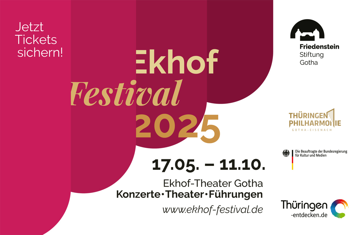 Theaterliebhaber:innen und Fans klassischer Musik erleben beim überregional beliebten Ekhof-Festival auf Schloss Friedenstein Gotha ganz besondere Highlights. Genießen Sie vom 17.05.-11.10.2025 eindrückliche Konzerte und Opernproduktionen der Thüringen-Philharmonie Gotha-Eisenach oder erleben Sie in Führungen die barocke Kulisse des historischen Ekhof-Theaters. Beim Schauspiel „Tartuffe“, das ab 11. Juli 2025 aufgeführt wird, kommt sogar die original erhaltene Bühnenmaschinerie aus dem 17. Jahrhundert zum Einsatz.