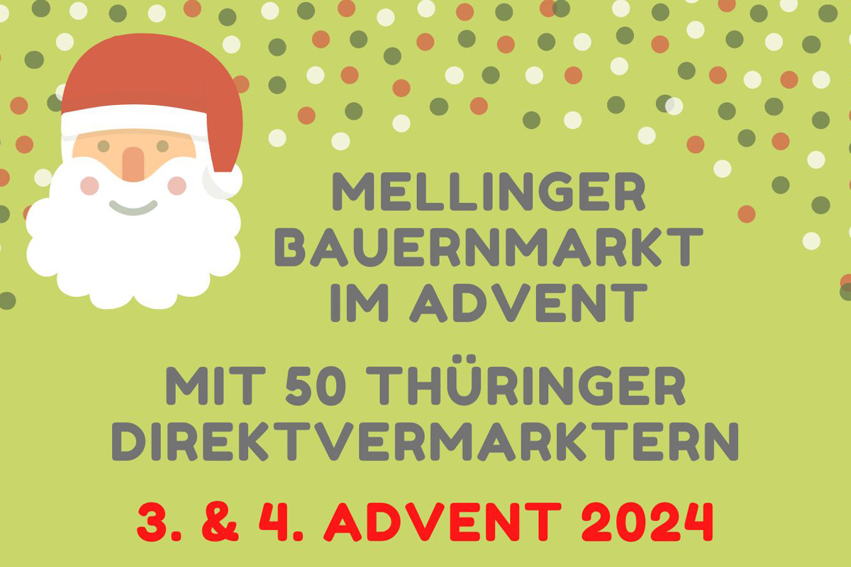 Wer beim Adventseinkauf Wert auf regionale Produkte legt, ist beim “Mellinger Bauernmarkt im Advent” genau richtig. 50 Thüringer Direktvermarkter & Handwerker bieten ihre meist regional erzeugten Produkte an. Die Besucher finden hier das klassische Weihnachtsgeflügel, Weihnachtsbäume, Wild, Wurstwaren, Fisch, Käse, Honig, Backwaren, Bier, Likör, Säfte, Marmelade, Obst, Gewürze, Nudeln & Senf, aber auch regionale Handwerksprodukte wie Felle, Holzprodukte, Wolle, Kerzen, Seife, Keramik & andere Geschenkideen.