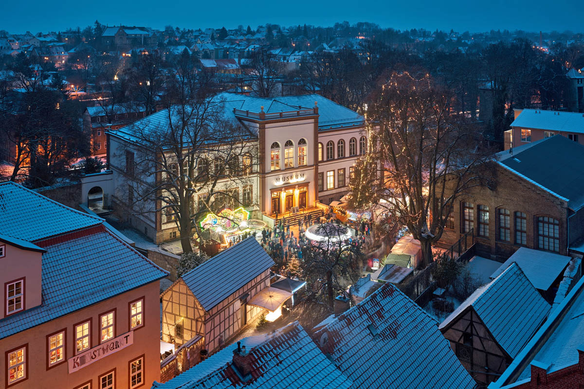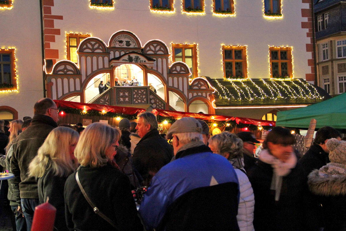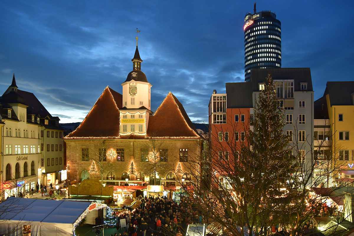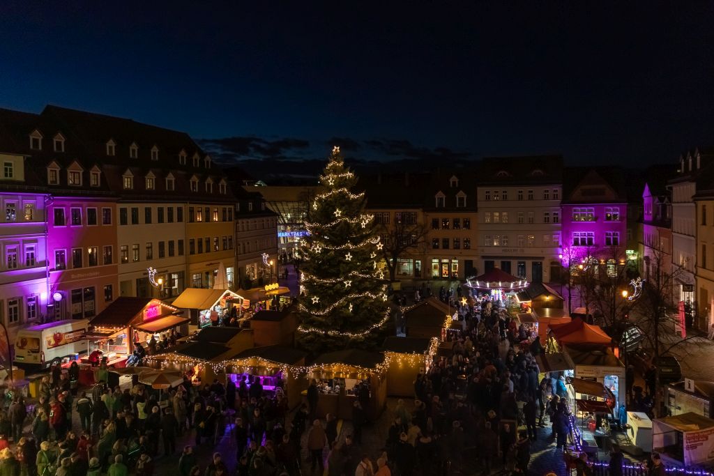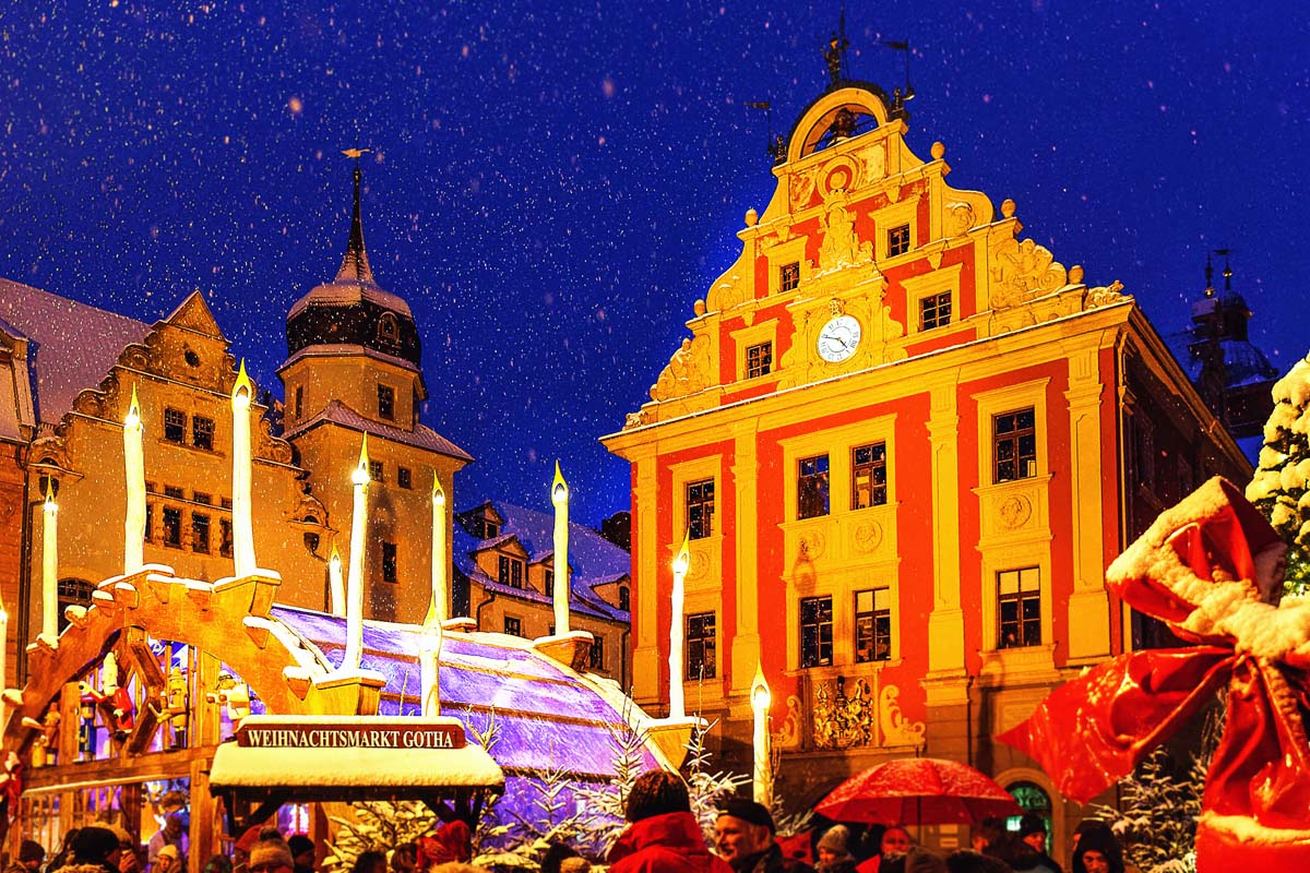 Mehr InformationenVom Rathausturm erklingen Weihnachtsmelodien, die große Pyramide dreht sich gleich neben der prächtigen Weihnachtstanne und der Weihnachtsmann kommt zum Türchen öffnen selbst vorbei. Die gesamte Weimarer Altstadt ist festlich geschmückt. Weihnachtshütten stehen nicht nur auf dem Markt, die Weimarer Weihnacht gastiert auf dem Herderplatz, in der Schillerstraße und reicht bis zum Theaterplatz. Besonders beliebt sind auch die täglichen Konzerte in der Stadtkirche St. Peter und Paul. Wer es sportlicher mag, dreht auf der Eisbahn zu Füßen des Goethe- und Schiller-Denkmals bei passender Musik beschwingte Runden.