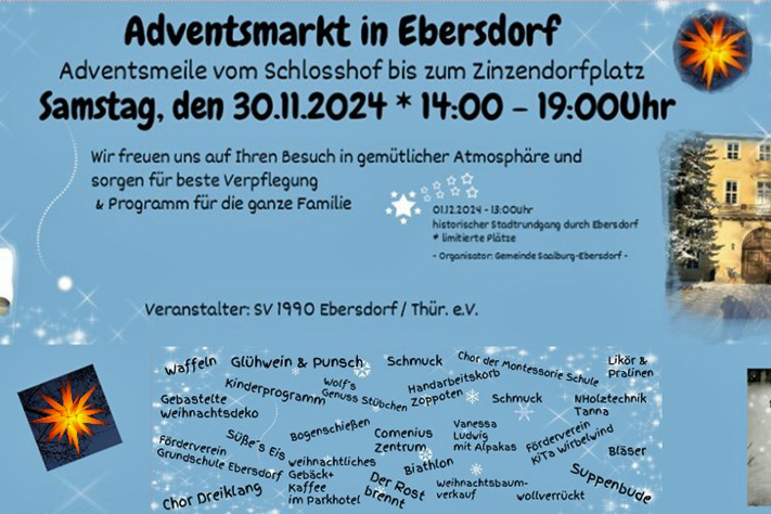 Der Adventsmarkt in Ebersdorf bietet ein buntes Programm entlang der Adventsmeile vom Schlosshof bis zum Zinzendorfplatz. Im Schlosshof gibt es Stände mit Weihnachtsbäumen, Dekorationen und kulinarischen Angeboten, sowie eine Bühne und Bastelangebote. Auf dem Weg zum Zinzendorfplatz bieten die Feuerwehr und "Wollverrückt" Waffeln, Glühwein und wollige Produkte an. Am Zinzendorfplatz gibt es Stände mit Windlichtern, Baumschmuck und Weihnachtsgebäck, sowie Alpakaprodukte, Liköre und Pralinen. Höhepunkte sind die Eröffnung durch Manuela Hirsch und Bläser, Auftritte verschiedener Chöre und eine Lesung im Kaminzimmer des Parkhotels. Den Abschluss bildet die feierliche Übergabe eines Adventskalendertürchens. Veranstalter ist der SV 1990 Ebersdorf/Thür. e.V.