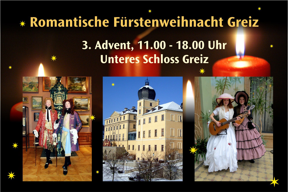 Der gesamte Hofstaat der Romantischen Fürstenweihnacht ist in historische Kostüme gewandet und lädt zu einem Spaß für die ganze Familie in das Greizer Residenzschloss ein. Die Besucher erleben zwischen 11-18 Uhr in dem romantischen Ambiente der historischen Räumlichkeiten des Unteren Schlosses eine weihnachtliche Zeitreise in das 18. und 19. Jahrhundert. Die historische Modenschauen und Konzerte entführen die Besucher in längst vergangene, aber nicht vergessene Zeiten.