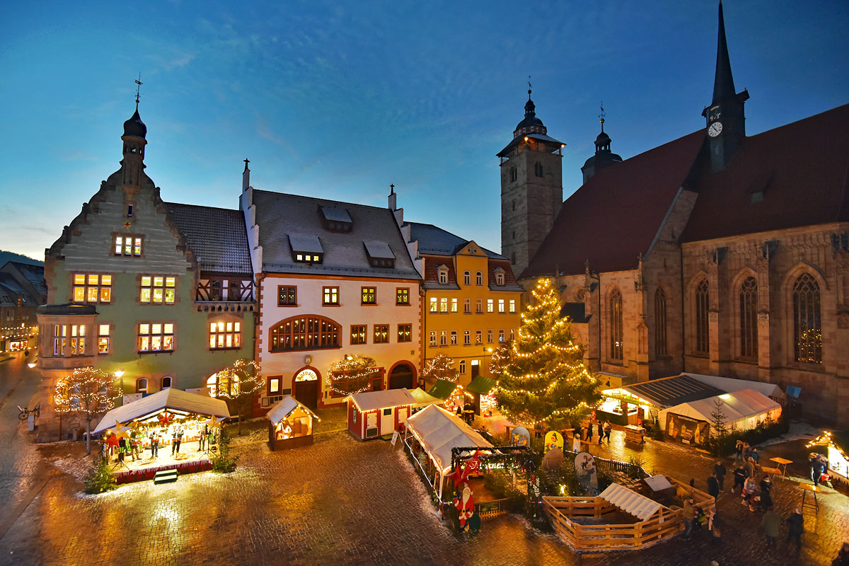 Mehr InformationenDer traditionelle Meininger Weihnachtszauber rund um den Heinrichsbrunnen findet vor der Stadtkirche auf dem Marktplatz eine beeindruckende Kulisse. Rund 30 festlich geschmückte Hütten bieten eine Vielzahl kulinarischer Versuchungen sowie eine feine Auswahl origineller Geschenkideen. Ein weiteres Highlight ist die 8 Meter hohe Weihnachtspyramide, in der die Offene Arbeit Meiningen mit Heißgetränken Groß und Klein zum Verweilen einlädt. Kleine Weihnachtsfans kommen in der Bastelhütte bei wechselnden Angeboten auf ihre Kosten und treffen in Meiningen den Weihnachtsmann. Und natürlich schallen auch in diesem Jahr wieder die weihnachtlichen Klänge der Meininger Turmbläser vom Turm der Stadtkirche über den Marktplatz.