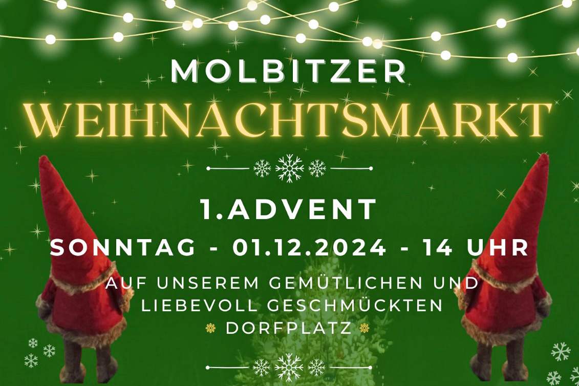 Am 1. Advent findet auf dem gemütlichen und liebevoll geschmückten Dorfplatz von Molbitz der Weihnachtsmarkt statt. Neben leckeren Speisen und weihnachtlichen Getränken gibt es Verkaufsstände mit weihnachtlichen Produkten sowie eine Überraschung für die kleinen Gäste.