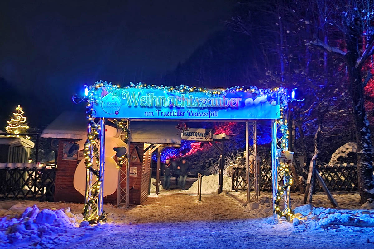 Erleben Sie den magischen Weihnachtszauber am Trusetaler Wasserfall. Umgeben von glitzernden Lichtern, verwandelt sich die Landschaft in ein zauberhaftes Winter-Wonderland, das Groß und Klein fasziniert.