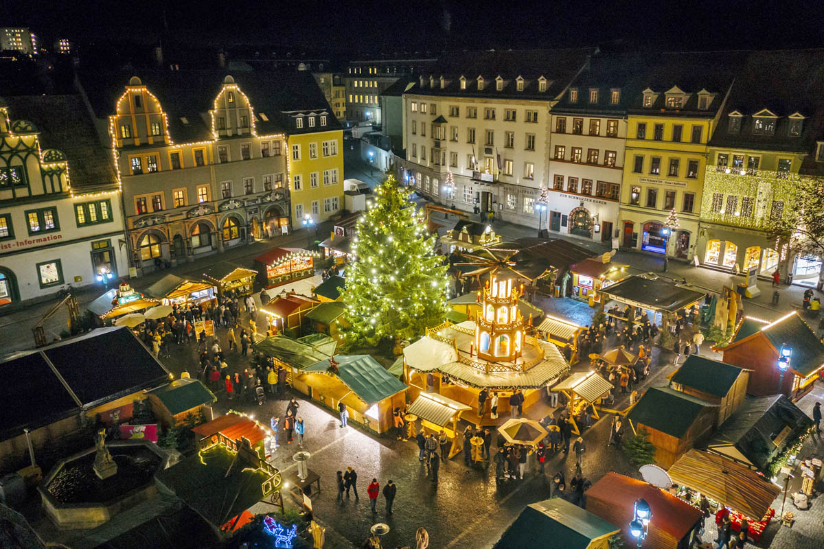 Die mittelalterliche Altstadt und der Domplatz sind die ideale Kulisse für eine stimmungsvolle Vorweihnachtszeit. Traditionelles Handwerk und Thüringer Spezialitäten sind ebenso zu finden wie eine 12m hohe, original Erzgebirgische Weihnachtspyramide. Der Erfurter Weihnachtsmarkt gehört zu den zehn schönsten Weihnachtsmärkten Deutschlands und ist der größte in Thüringen. Die Innenstadt liegt im Lichterglanz, Geschäfte und Kaufhäuser haben Adventsschmuck angelegt. Weihnachtsmelodien erklingen und der Duft von Glühwein und Pfefferkuchen liegt in der Luft. Bemerkenswert sind die festlich beleuchtete Weihnachtstanne, die Krippe mit 14 handgeschnitzten, fast lebensgroßen Holzfiguren und die 12 Meter hohe Weihnachtspyramide.