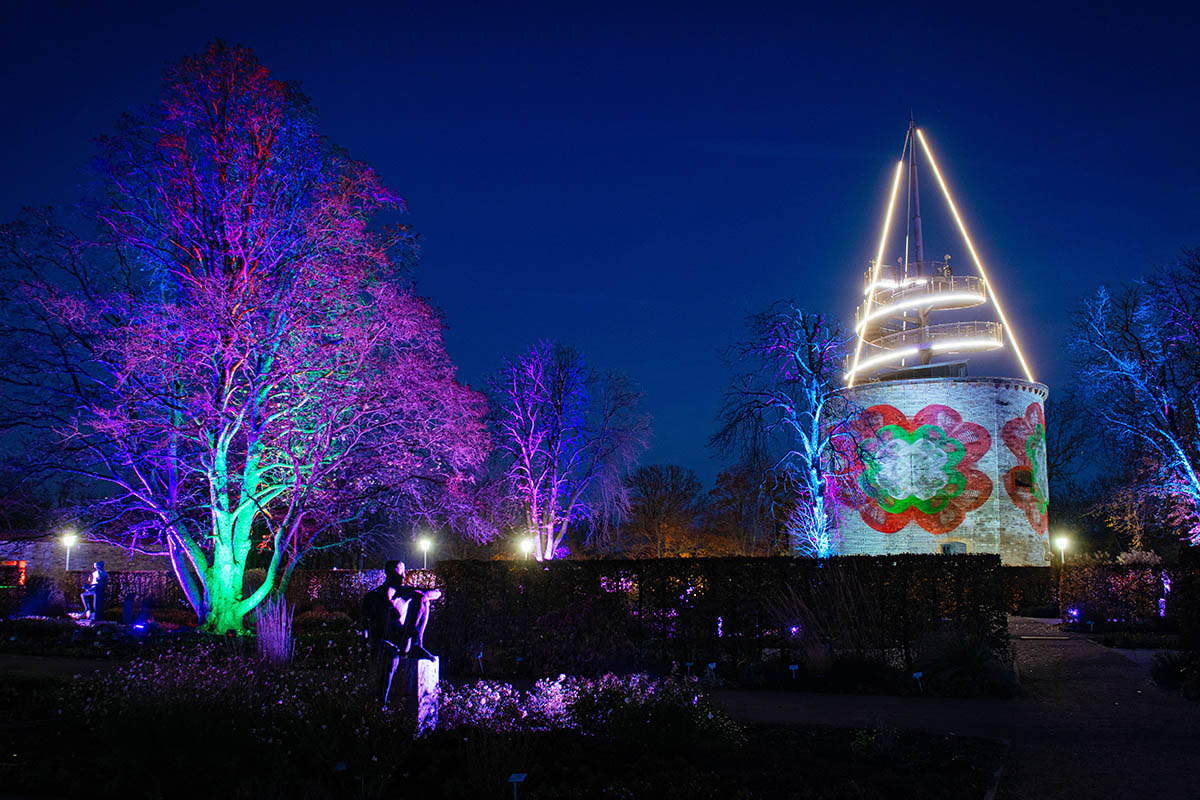 Flanieren Sie vom Haupteingang, entlang der großen Wiese, über Danakil bis hin zum Rosengarten und dem Deutschen Gartenbaumuseum. Die einzigartige Atmosphäre des winterlichen Parks voller bezaubernder Lichtinstallationen sorgt bei Groß und Klein für glänzende Augen.