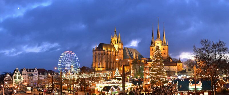 Die mittelalterliche Altstadt und der Domplatz sind die ideale Kulisse für eine stimmungsvolle Vorweihnachtszeit. Traditionelles Handwerk und Thüringer Spezialitäten sind ebenso zu finden wie eine 12m hohe, original Erzgebirgische Weihnachtspyramide. Der Erfurter Weihnachtsmarkt gehört zu den zehn schönsten Weihnachtsmärkten Deutschlands und ist der größte in Thüringen. Die Innenstadt liegt im Lichterglanz, Geschäfte und Kaufhäuser haben Adventsschmuck angelegt. Weihnachtsmelodien erklingen und der Duft von Glühwein und Pfefferkuchen liegt in der Luft. Bemerkenswert sind die festlich beleuchtete Weihnachtstanne, die Krippe mit 14 handgeschnitzten, fast lebensgroßen Holzfiguren und die 12 Meter hohe Weihnachtspyramide.